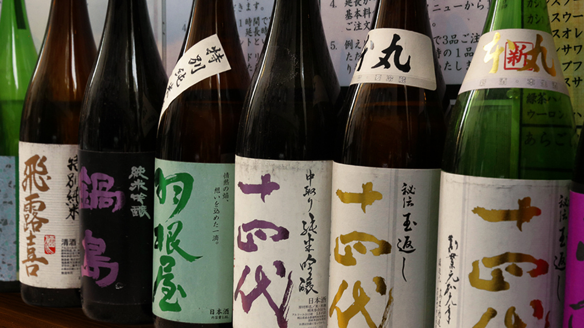 定番日本酒銘柄~有名プレミアム銘柄、焼酎もプレミアム含め約10種類程度等幅広く品揃えしております。日本酒は常時15種類程をご提供、50種類程を在庫して入れ替えしております。