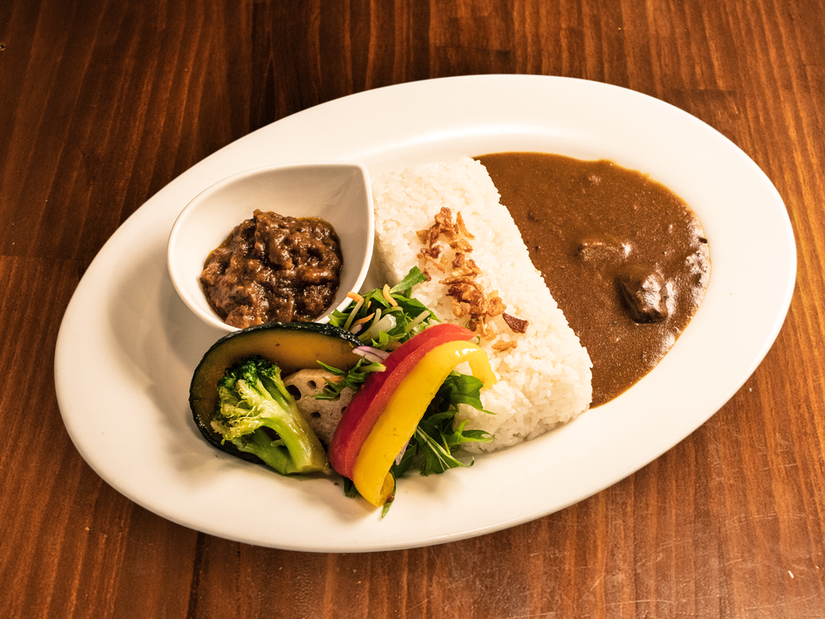 柔らかくなるまで煮込んだ牛すじカレーを3日寝かせ熟成させてご提供しています。一口目に甘味。その後に追いかけてくるスパイスの香りとコク。福神漬けとらっきょうがよく合う王道の日本式カレーです。